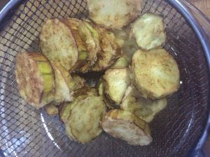 锅里放油炸茄子,至发黄捞出备用