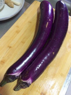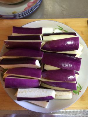 茄子洗净,切成长条后在淡盐水里泡10分钟左右,这样的处理会让后续炸茄子时更省油