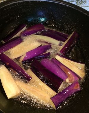 下锅炸一下,改小火,慢慢炸透(茄子塌软),泛金黄捞出沥干油份,待用