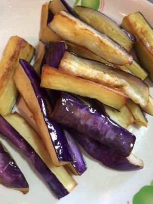 捞起茄子,控干水分,热锅起油,下茄子,中小火煎软后盛出