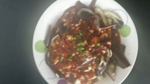 锅放油热后加入郫县豆瓣酱两勺,放入葱花,蒜末,淋入调好的汁。等汁粘稠后淋入茄子上。出锅~撒上点葱花点缀一下吧