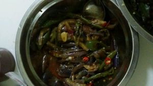3.放入茄子和青辣椒,炒一会后,加适量水,不停翻炒