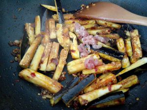 锅里放少许油把肉末也炒熟,中间淋点料酒去腥,加入甜酱,摆入茄子,加点水,让茄子吸收酱汁。