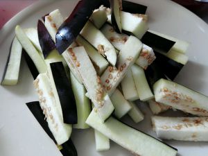 将切好的茄子条平铺大盘上,放入蒸锅中蒸熟(约8-10分钟)。