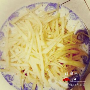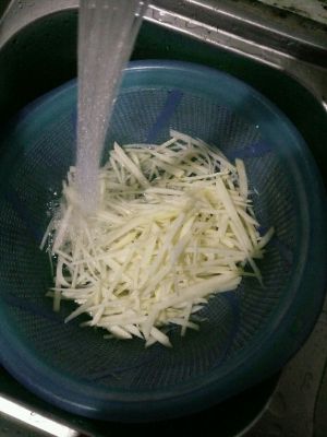 锅里水分干了就放油下去,接着放辣椒爆炒一下就放土豆丝下去翻炒,必须不断翻炒不然粘锅底,等土豆丝软了就放盐,醋,一点白糖下去不断翻炒,炒八分熟就可以了,起锅前加一点鸡精粉调料