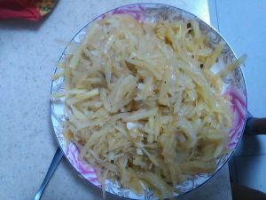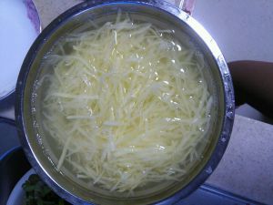 盆子里放上凉水,把土豆插成细丝,插丝时慢点小心手别插伤