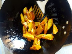 迅速下入炸好的地瓜块,快速翻炒均匀。