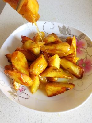 小火均匀熬糖呈蜂蜜状,改中火倒入备用的地瓜块,快速翻炒盛盘 OK。
