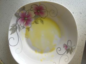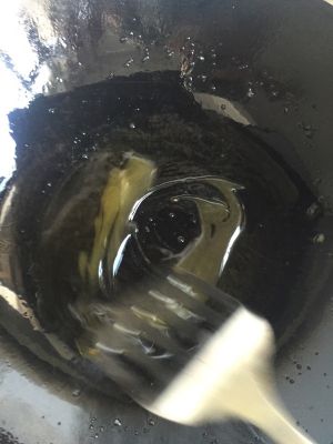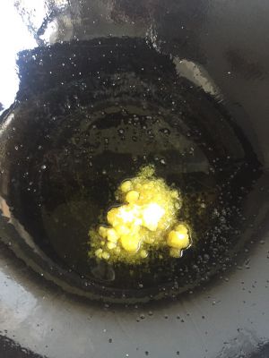 锅内留少许油,加入白糖,小火慢熬,熬到起泡,糖汁发黄即可