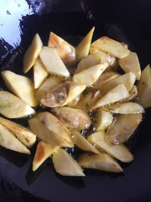 锅里加油,油热后地瓜块下锅,炸成金黄色,用筷子夹,软了就可以了。