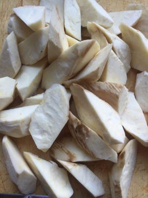 红薯切滚刀块。 »妈妈们可以根据宝宝的咀嚼能力决定红薯块大小。
