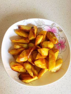 锅内花生油七八分热放地瓜中火煎炸至两面金黄后用筷子插入感觉松软即可。