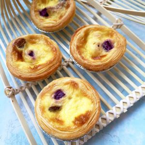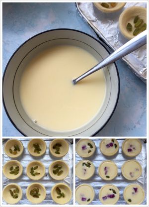 把调好的原料倒入蛋挞皮,不要太满,倒7成或者8成满就好。