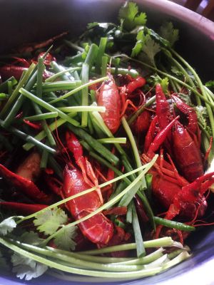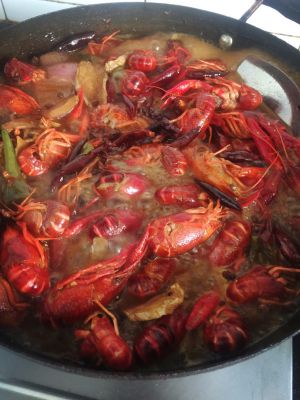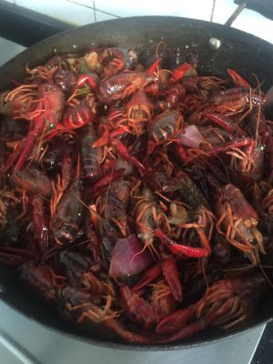 倒油,加花椒、干辣椒、姜、蒜爆香,再加入豆瓣酱、八角,葱、炒5分钟。再倒入小龙虾,大火翻炒,至虾变红不动。