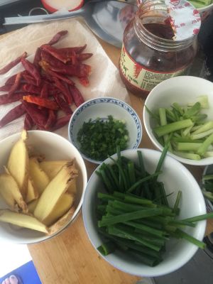 锅中倒入适量油,放入葱姜蒜爆香;香味溢出后,放入花椒和干辣椒