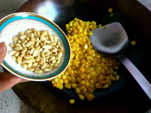 倒入玉米翻炒一下,放入盐,糖继续翻炒,然后放入松仁