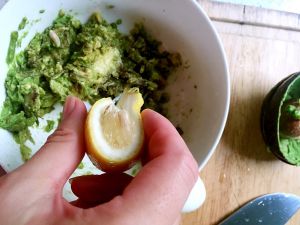 挤上四分之一柠檬汁于牛油果泥中。1可以调节口味,2使牛油果不易变黑。再加入少许盐搅拌。