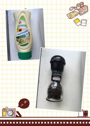 将蛋黄酱、黑胡椒、盐放入碗中调味打底。