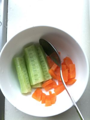 将切好的黄瓜胡萝卜汆水后立刻捞出。