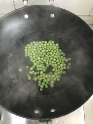 玉米蒸熟,冷水凉过,剥下别过水。豌豆焯水,有条件的用小元宵热水煮熟备用