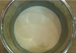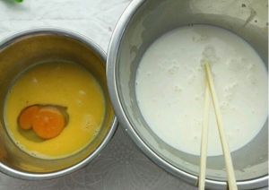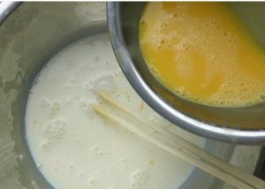 将蛋液分4次倒入牛奶混合液中混合均匀