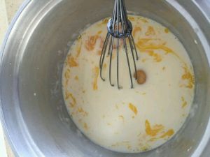 待完全冷却,加入事先准备好的蛋黄2-3个,用打蛋器搅拌均匀。