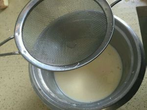 牛奶和糖小火搅拌,待糖溶解后马上关火放置冷却