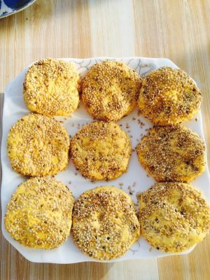白芝麻里放一小撮黑芝麻拌匀,把南瓜球均匀粘上芝麻,用手轻轻把它压成厚度均匀的饼。