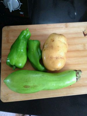 姜蒜切碎,锅中底油超香,放土豆茄子青椒,加盐,糖,酱油。出锅。