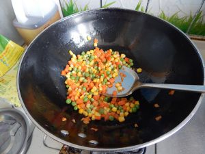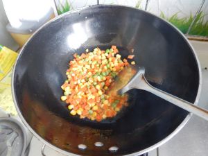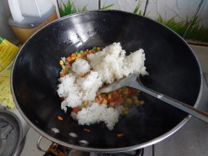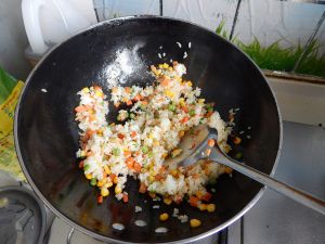 重起油锅,下米饭翻炒二分钟,让米饭粒粒分明