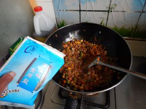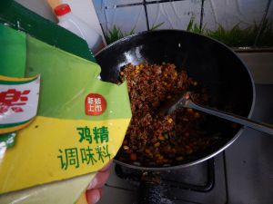 倒入鸡蛋丁,火腿丁香葱翻炒三分钟,放入适量的鸡精和盐调味