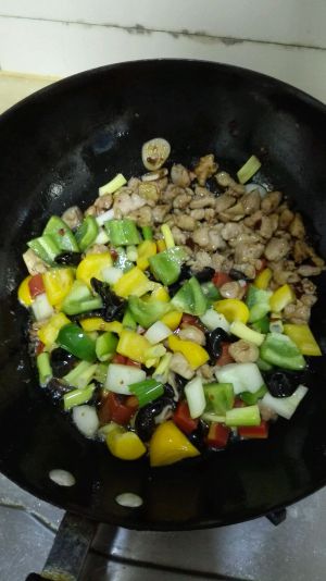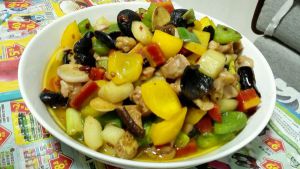 把鸡丁放锅中炒熟再倒入煮好的蔬菜放盐生抽排骨精出锅