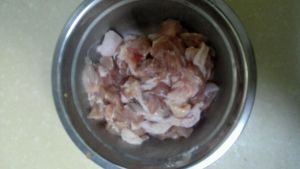 鸡腿去骨切丁。加少许盐码味,再加淀粉。
