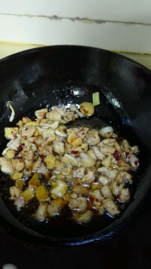 油热放入葱和姜炒出香味后下鸡丁、炒至变色后放入其他材料翻炒后闷一会,放入适量调味料就可以起锅了