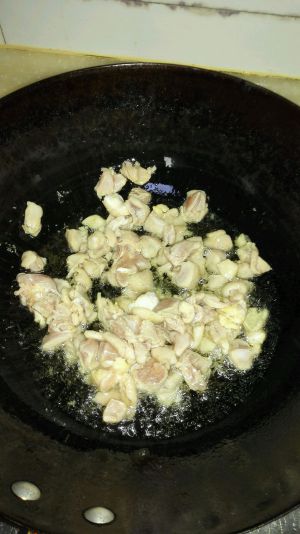 锅中加入油,油温4成热时放入鸡丁。炒到表皮变色。