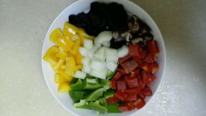 黄瓜、胡萝卜、青椒、香菇都切成小丁