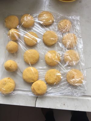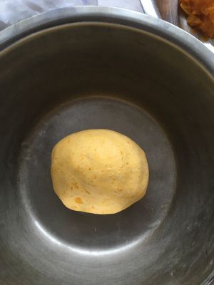 这个时候开始弄馅。揉圆。我做的是南瓜面团50克馅20。馅是我做月饼的时候剩的。