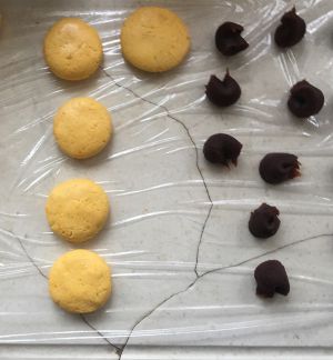 将南瓜泥分成15克一个的剂子,豆沙10个一个,一个剂子配一份豆沙,包好后拍成扁圆形,(因为是要下油锅炸,扁的比圆的用油少)