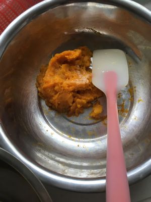 老样子南瓜蒸熟。蒸好加糖。一起压成泥。