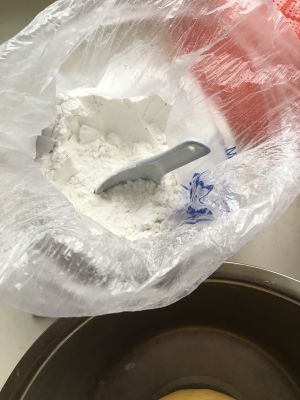 把揉圆好的面团拍扁。放馅。收口。面团上的是用牙签压成米字。