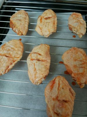 下面记得烤盘接住,哪怕不刷油都会烤出油的!180度烤20分钟,我中途还翻了一面,不过要看各家烤箱火候了,我觉得我这次味道一般,下次改进刷点油试一下!