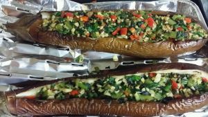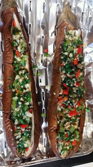 拿出烤软的茄子(注意:取出时烤盘温度非常高,请务必小心哦!),将茄子翻转茄身,把拌匀备用的调料铺在茄子肉身上边最好能讲酱料塞入茄子缝隙中,有助入味