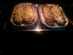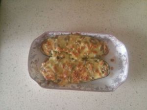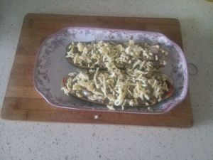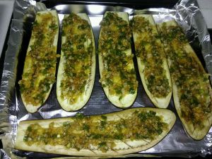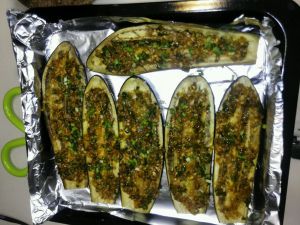 考好的茄子刀或筷子把茄子扒开两半,软了加调好的汁,不软就再考5-10分钟再加。酱汁加完200度15分钟。