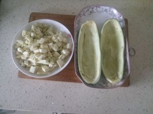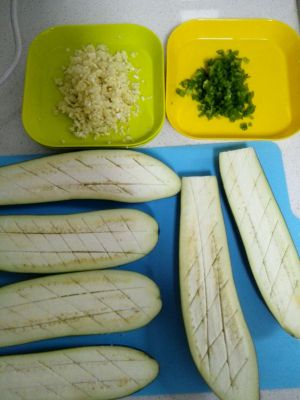 茄子洗净,对切。蒜头和青椒剁碎,青椒