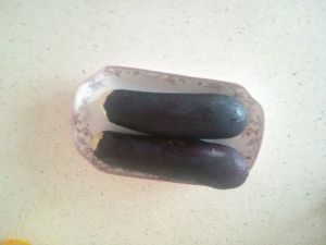 茄子对切,我的茄子有点大了所以一切四了,锅里放少许油,把有切面的先入锅小火煎软了在反面煎,稍微撒点细盐增加点咸味不能多哦。