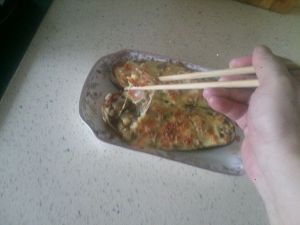 最后在茄子上放入炒好的蒜泥料,小葱在煎一会就可以出锅了。