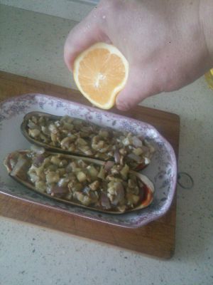 茄子受汁盛盘,加柠檬汁。茄子壳可以微波炉高火加工成熟,吃不吃由自己,