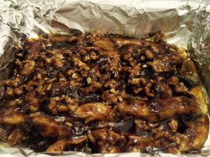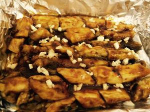 1.烤盘上铺好锡纸,放上蒸好的茄子;2.均匀刷一层酱料;3.撒上大蒜;4.放烤箱,上下火180度10分钟