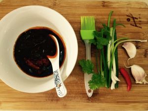 酱料拌均装碗,葱段洗好切粒,刷子一把,备用