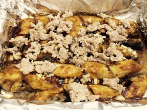 茄子出烤箱后用筷子把那切开的口子撑开,把我们刚调制好的酱料填进去,这个图是刚填上去的。填好后发现还有点汁,我就把它倒进烤盘里了。再进烤箱200度,十分钟